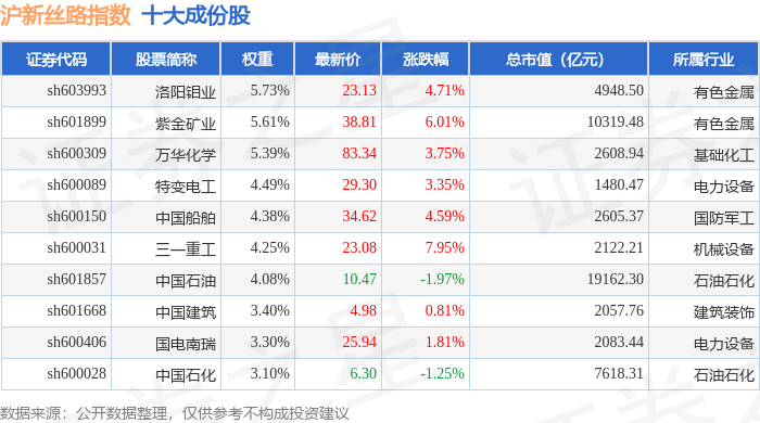 证券之星消息,2月3日,沪新丝路(000160)指数报收于2335.48点,涨2.83%,成交1265.61亿元,换手率1.11%。当日该指数成份股中,上涨的有67家,三一重工以7.95%的涨幅领涨,下跌的有4家,白银有色以10.0%的跌幅领跌。