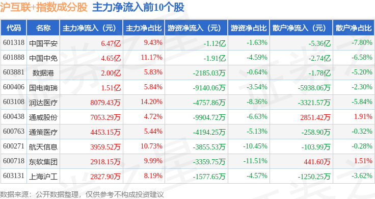 资金流向方面,沪互联+(000162)指数成份股当日主力资金净流出合计3727.95万元,游资资金净流出合计6.0亿元,散户资金净流入合计6.37亿元。成份股资金流向详情见下表: