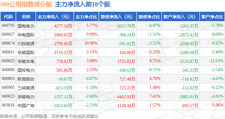 资金流向方面,300公用(000917)指数成份股当日主力资金净流出合计2.06亿元,游资资金净流入合计5838.03万元,散户资金净流入合计1.48亿元。成份股资金流向详情见下表: