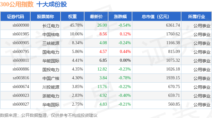 300公用(000917)指数十大成份股详情如下:
