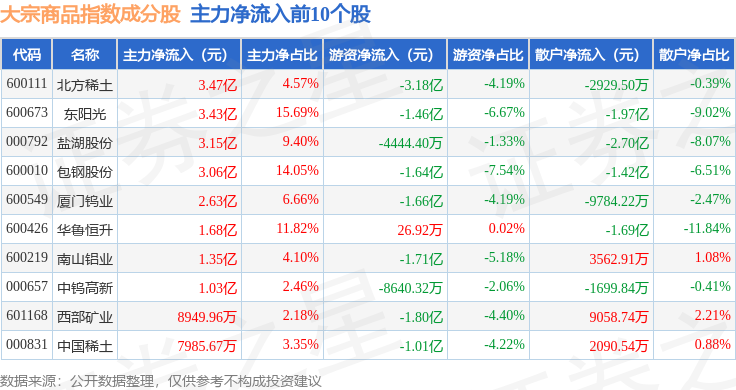资金流向方面,大宗商品(000979)指数成份股当日主力资金净流出合计30.64亿元,游资资金净流出合计15.84亿元,散户资金净流入合计46.49亿元。成份股资金流向详情见下表: