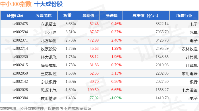 中小300(399008)指数十大成份股详情如下: