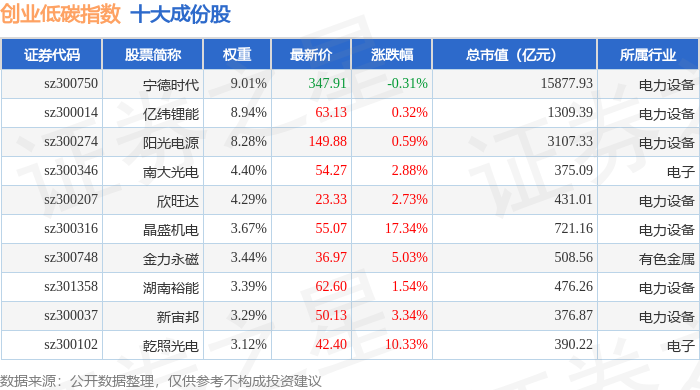 创业低碳(399259)指数十大成份股详情如下: