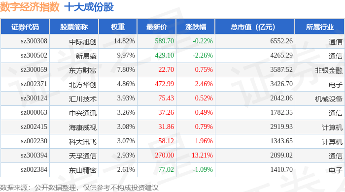 数字经济(399262)指数十大成份股详情如下: