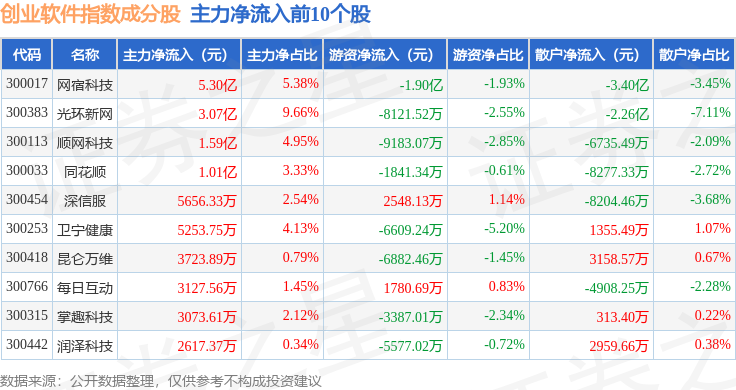 资金流向方面,创业软件(399264)指数成份股当日主力资金净流入合计4.66亿元,游资资金净流出合计9.12亿元,散户资金净流入合计4.46亿元。成份股资金流向详情见下表: