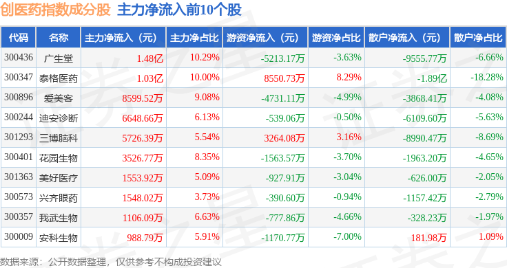 资金流向方面,创医药(399275)指数成份股当日主力资金净流入合计1.4亿元,游资资金净流出合计2.52亿元,散户资金净流入合计1.12亿元。成份股资金流向详情见下表: