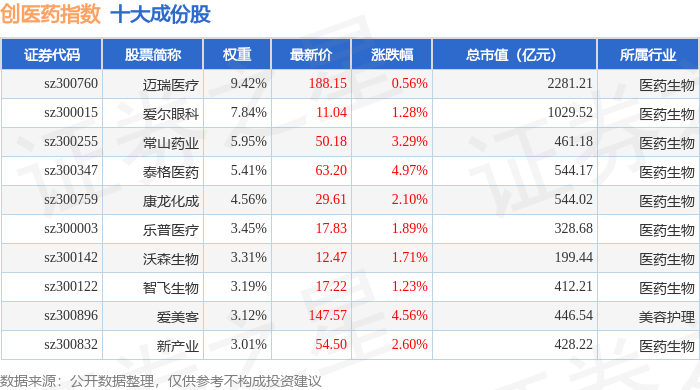 证券之星消息,2月3日,创医药(399275)指数报收于2688.72点,涨2.12%,成交168.96亿元,换手率1.61%。当日该指数成份股中,上涨的有47家,迪安诊断以6.69%的涨幅领涨,下跌的有2家,博雅生物以0.13%的跌幅领跌。