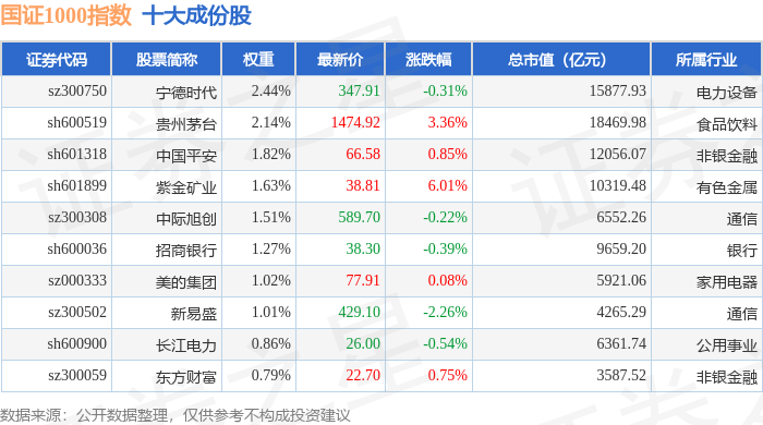 国证1000(399311)指数十大成份股详情如下: