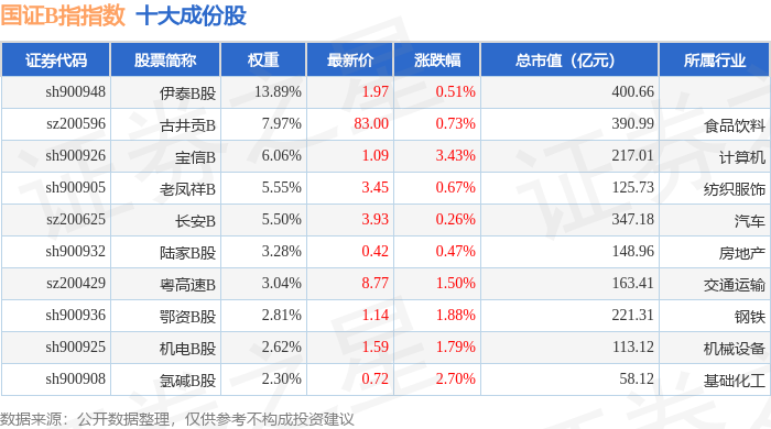 证券之星消息,2月3日,国证B指(399318)指数报收于5196.9点,涨1.13%,成交1.69亿元,换手率0.16%。当日该指数成份股中,上涨的有63家,中毅达B以5.52%的涨幅领涨,下跌的有6家,皇庭B以10.14%的跌幅领跌。