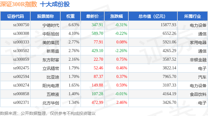 深证300R(399344)指数十大成份股详情如下: