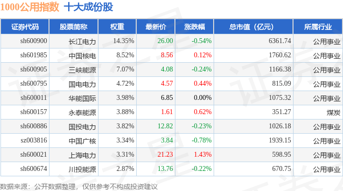 1000公用(399390)指数十大成份股详情如下: