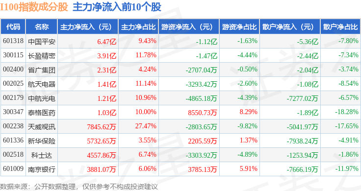 资金流向方面,I100(399415)指数成份股当日主力资金净流入合计2.6亿元,游资资金净流入合计3930.54万元,散户资金净流出合计2.99亿元。成份股资金流向详情见下表: