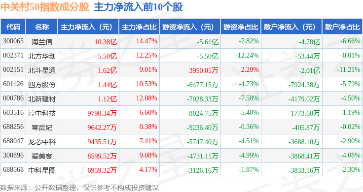 资金流向方面,中关村50(399423)指数成份股当日主力资金净流入合计20.92亿元,游资资金净流出合计21.39亿元,散户资金净流入合计4675.49万元。成份股资金流向详情见下表: