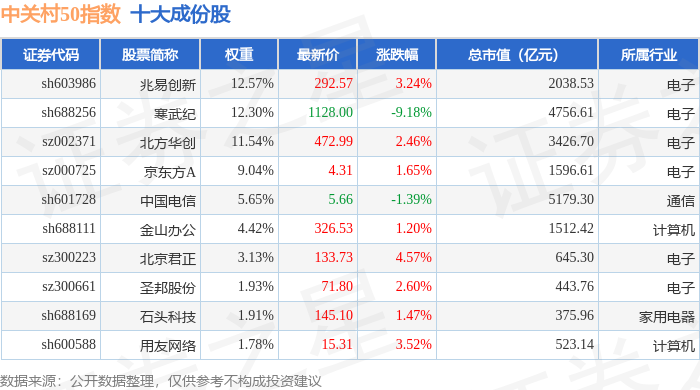证券之星消息,2月3日,中关村50(399423)指数报收于3165.72点,涨1.25%,成交854.88亿元,换手率1.63%。当日该指数成份股中,上涨的有46家,海兰信以15.82%的涨幅领涨,下跌的有4家,寒武纪以9.18%的跌幅领跌。