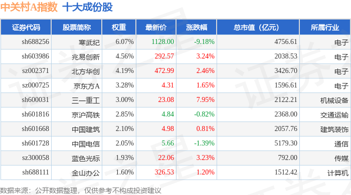 中关村A(399422)指数十大成份股详情如下: