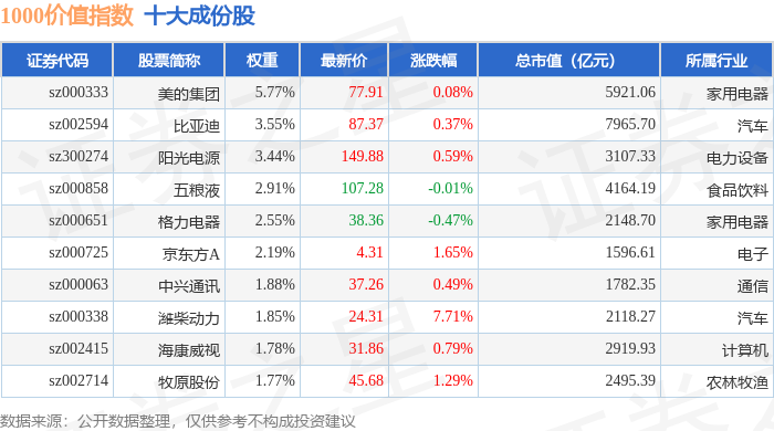 证券之星消息,2月3日,1000价值(399631)指数报收于2327.59点,涨1.88%,成交2089.68亿元,换手率1.81%。当日该指数成份股中,上涨的有279家,网宿科技以14.4%的涨幅领涨,下跌的有42家,恒邦股份以3.44%的跌幅领跌。