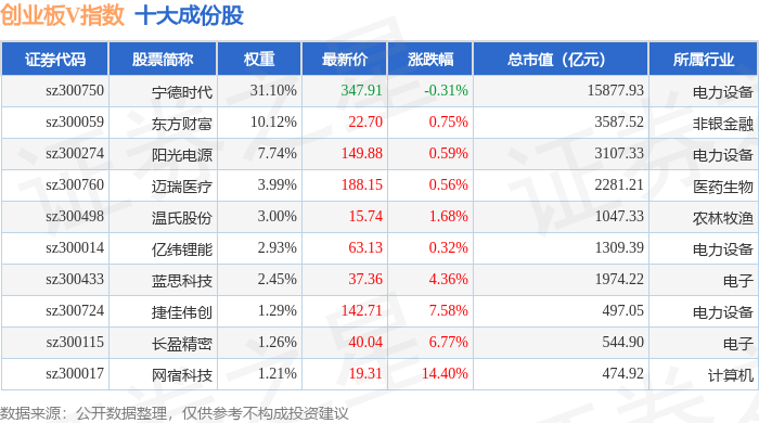 创业板V(399668)指数十大成份股详情如下: