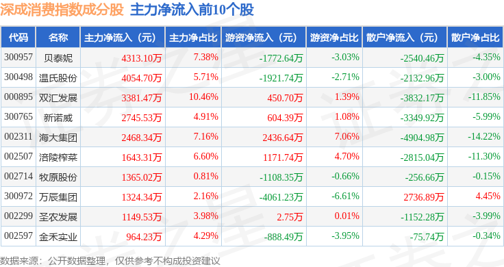 资金流向方面,深成消费(399684)指数成份股当日主力资金净流出合计4.47亿元,游资资金净流入合计9746.59万元,散户资金净流入合计3.49亿元。成份股资金流向详情见下表: