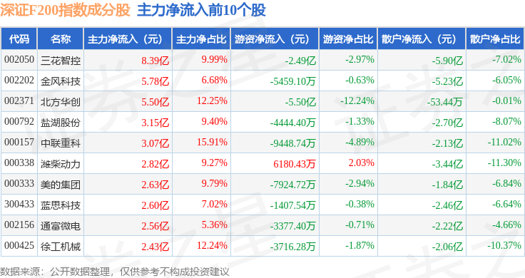 资金流向方面,深证F200(399703)指数成份股当日主力资金净流出合计14.7亿元,游资资金净流入合计3.41亿元,散户资金净流入合计11.28亿元。成份股资金流向详情见下表: