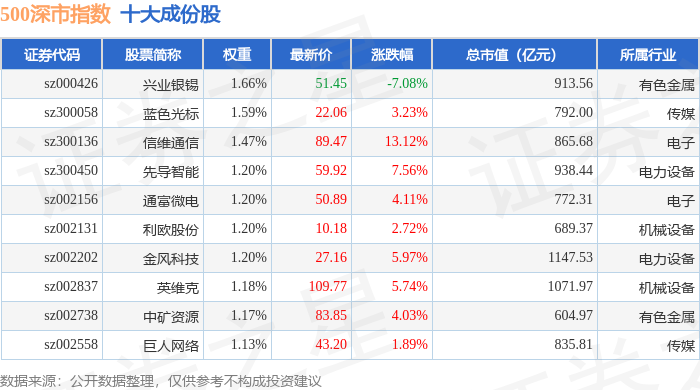 500深市(399802)指数十大成份股详情如下: