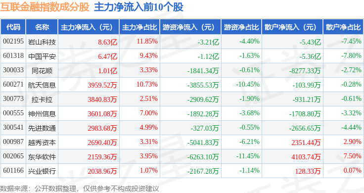 资金流向方面,互联金融(399805)指数成份股当日主力资金净流入合计6.95亿元,游资资金净流出合计6.0亿元,散户资金净流出合计1.05亿元。成份股资金流向详情见下表: