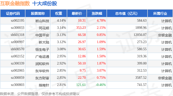 互联金融(399805)指数十大成份股详情如下:
