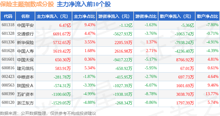 资金流向方面,保险主题(399809)指数成份股当日主力资金净流出合计3.62亿元,游资资金净流入合计1.35亿元,散户资金净流入合计2.28亿元。成份股资金流向详情见下表: