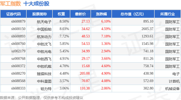 军工指数(399959)十大成份股详情如下: