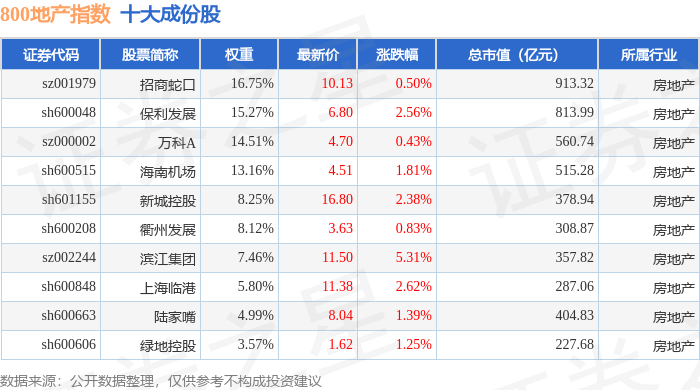 800地产(399965)指数十大成份股详情如下: