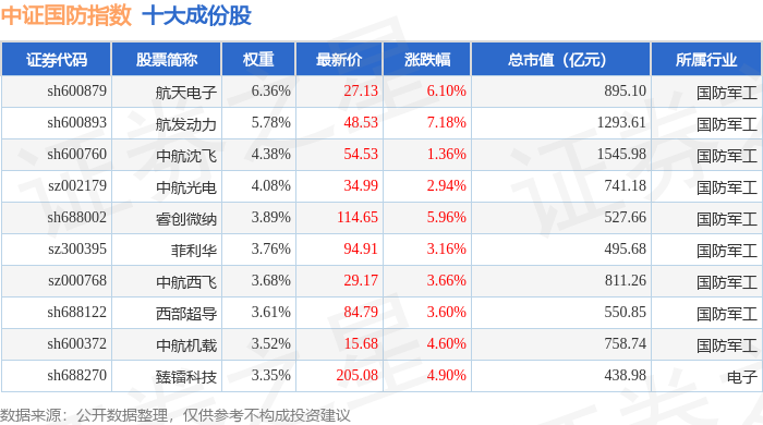 中证国防(399973)指数十大成份股详情如下: