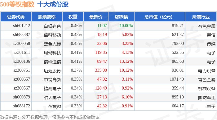 证券之星消息,2月3日,500等权(399982)指数报收于9875.45点,涨2.82%,成交5432.64亿元,换手率2.44%。当日该指数成份股中,上涨的有457家,罗博特科以20.0%的涨幅领涨,下跌的有39家,白银有色以10.0%的跌幅领跌。