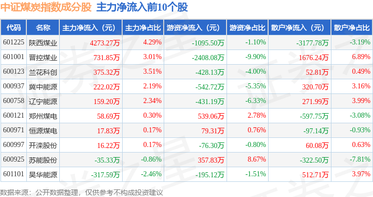 资金流向方面,中证煤炭(399998)指数成份股当日主力资金净流出合计4.58亿元,游资资金净流入合计5369.35万元,散户资金净流入合计4.05亿元。成份股资金流向详情见下表:
