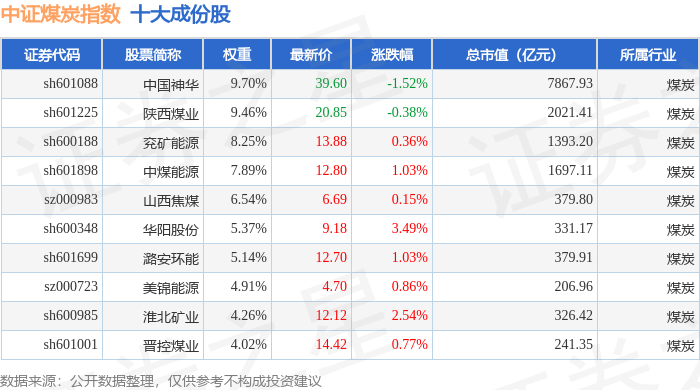 证券之星消息,2月3日,中证煤炭(399998)指数报收于2048.06点,涨0.57%,成交96.41亿元,换手率1.14%。当日该指数成份股中,上涨的有23家,华阳股份以3.49%的涨幅领涨,下跌的有5家,昊华能源以1.57%的跌幅领跌。