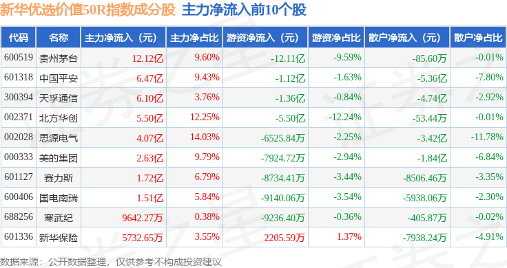 资金流向方面,新华优选价值50R(489004)指数成份股当日主力资金净流出合计22.87亿元,游资资金净流入合计4.7亿元,散户资金净流入合计18.16亿元。成份股资金流向详情见下表:
