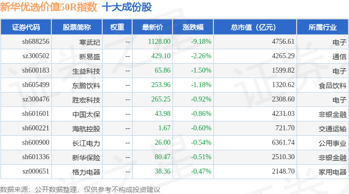新华优选价值50R(489004)指数十大成份股详情如下: