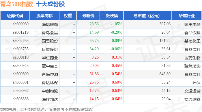 青岛50R(489011)指数十大成份股详情如下: