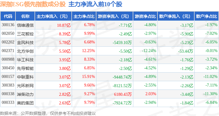 资金流向方面,深指ESG领先(970029)指数成份股当日主力资金净流入合计16.96亿元,游资资金净流出合计17.93亿元,散户资金净流入合计9644.17万元。成份股资金流向详情见下表: