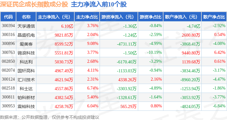 资金流向方面,深证民企成长(970071)指数成份股当日主力资金净流出合计44.01亿元,游资资金净流入合计28.05亿元,散户资金净流入合计15.96亿元。成份股资金流向详情见下表: