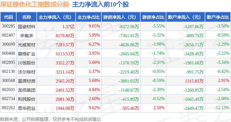 资金流向方面,深证绿色化工(970076)指数成份股当日主力资金净流出合计3.03亿元,游资资金净流出合计4.81亿元,散户资金净流入合计7.83亿元。成份股资金流向详情见下表: