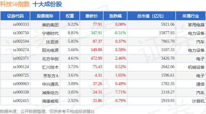 科技50(970080)指数十大成份股详情如下: