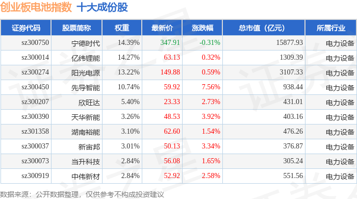 证券之星消息,2月3日,创业板电池(970081)指数报收于3265.51点,涨2.38%,成交413.14亿元,换手率2.91%。当日该指数成份股中,上涨的有42家,华自科技以10.36%的涨幅领涨,下跌的有1家,宁德时代以0.31%的跌幅领跌。