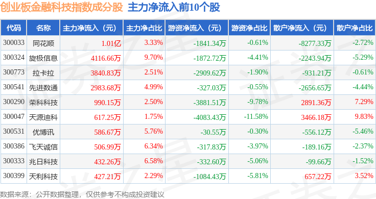 资金流向方面,创业板金融科技(970085)指数成份股当日主力资金净流出合计8.01亿元,游资资金净流出合计1.3亿元,散户资金净流入合计9.31亿元。成份股资金流向详情见下表: