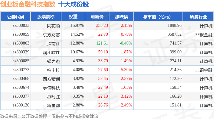 创业板金融科技(970085)指数十大成份股详情如下:
