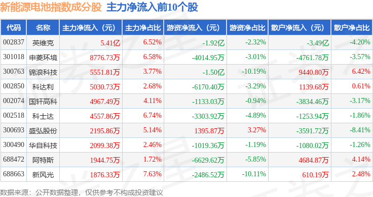 资金流向方面,新能源电池(980027)指数成份股当日主力资金净流入合计1.92亿元,游资资金净流出合计8.86亿元,散户资金净流入合计6.94亿元。成份股资金流向详情见下表: