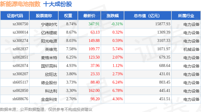 新能源电池(980027)指数十大成份股详情如下: