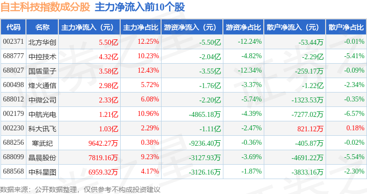 资金流向方面,自主科技(980033)指数成份股当日主力资金净流入合计4.36亿元,游资资金净流出合计6.59亿元,散户资金净流入合计2.23亿元。成份股资金流向详情见下表: