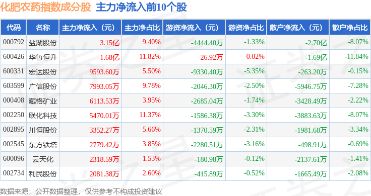 资金流向方面,化肥农药(980035)指数成份股当日主力资金净流入合计6.26亿元,游资资金净流出合计4.29亿元,散户资金净流出合计1.98亿元。成份股资金流向详情见下表: