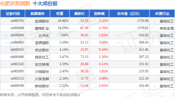 化肥农药(980035)指数十大成份股详情如下: