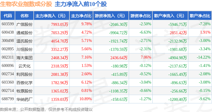 资金流向方面,生物农业(980072)指数成份股当日主力资金净流出合计3.72亿元,游资资金净流出合计2.98亿元,散户资金净流入合计6.15亿元。成份股资金流向详情见下表: