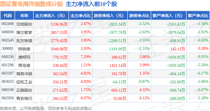 资金流向方面,国证青岛海洋(980532)指数成份股当日主力资金净流入合计6598.11万元,游资资金净流出合计3026.71万元,散户资金净流出合计3626.87万元。成份股资金流向详情见下表: